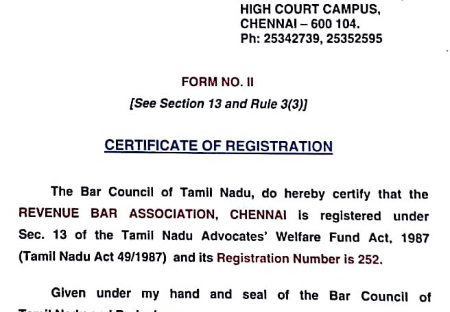 The Bar Council of Tamil Nadu has certified that the Revenue Bar Association, Chennai is registered under Sec.13 of the Tamil Nadu Advocate Welfare Fund, Act 1987.